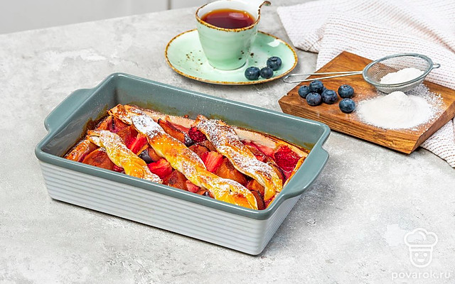 Немного припылите сахарной пудрой начинку. Нарежьте пирог на кусочки и подайте со свежезаваренным чаем.