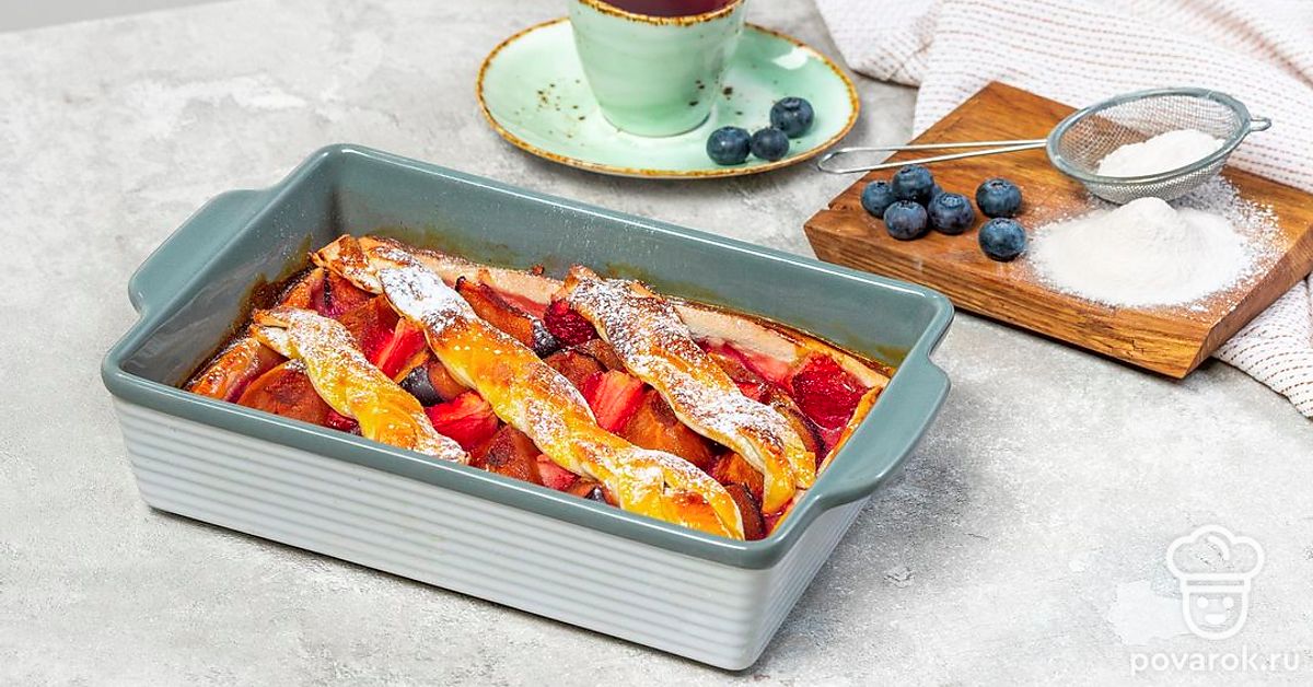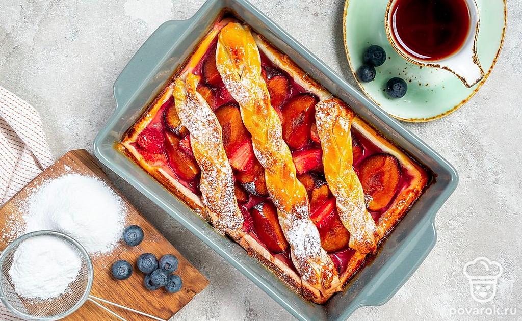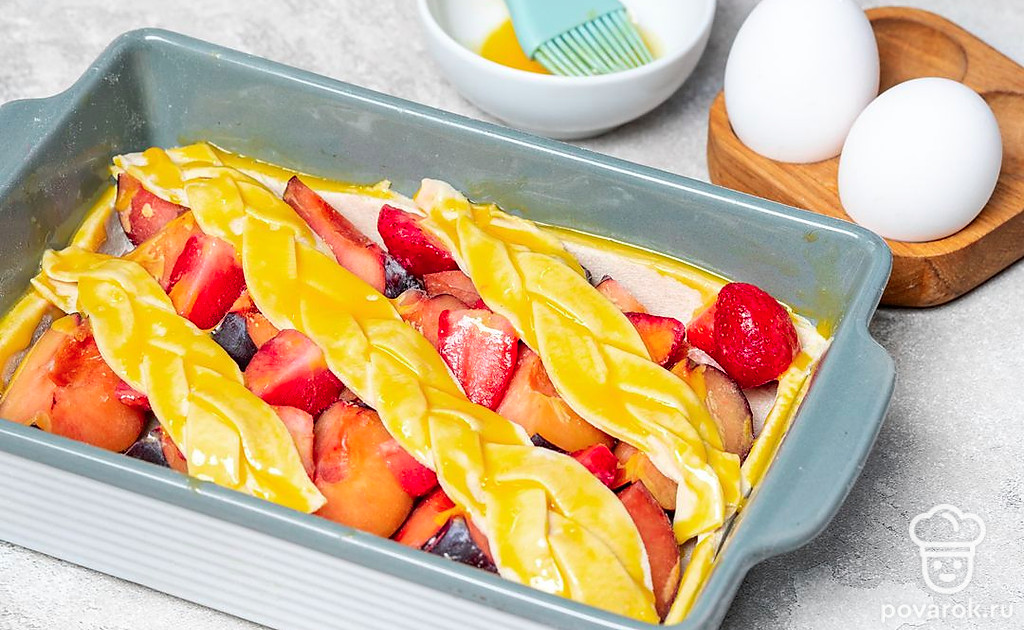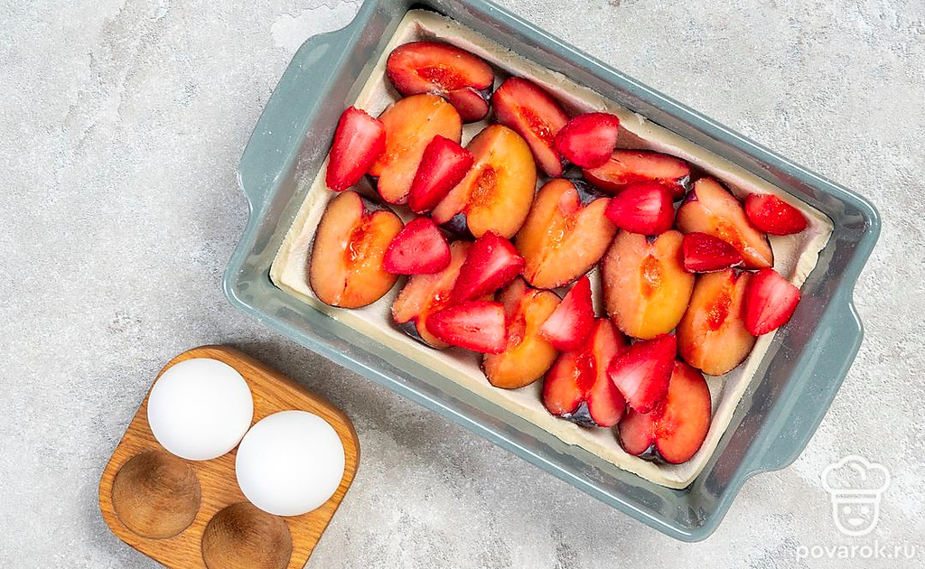 Разморозьте тесто, клубнику и сливы. С фруктов и ягод слейте при необходимости лишний сок. Приготовьте форму для запекания и кулинарную кисточку. Духовку разогрейте до 180 градусов.