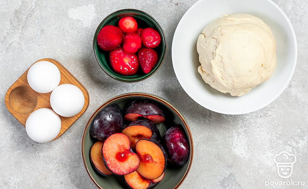 Тесто можно сделать самостоятельно. Клубнику и сливы выбирайте свежие из нового урожая.