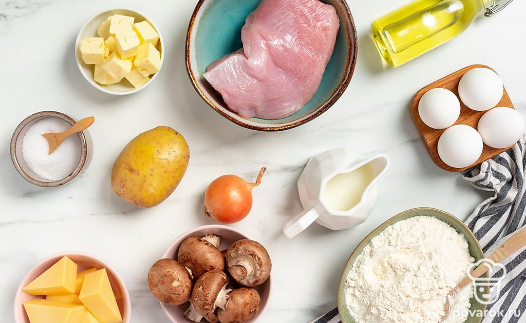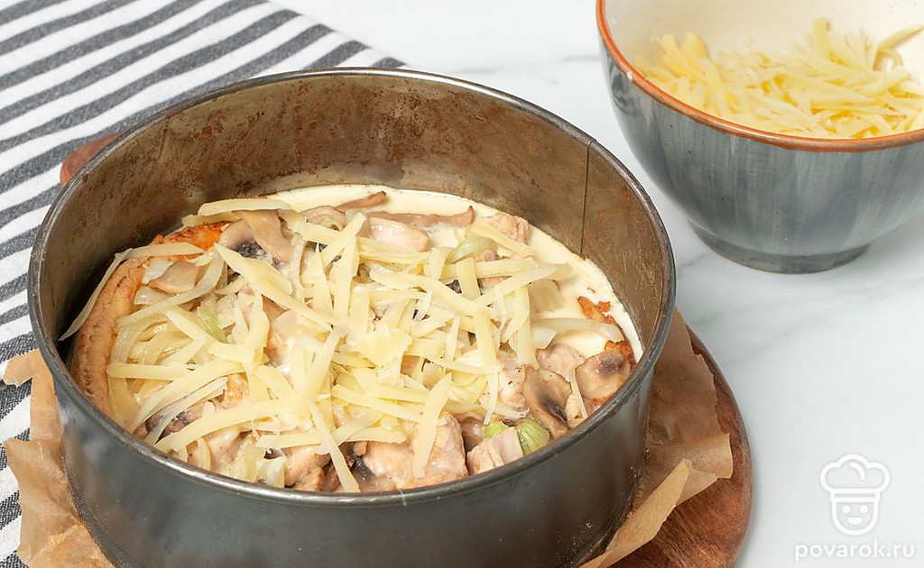 Сытный пирог из филе индейки, грибов и картошки. Песочное тесто придает пирогу интересную структуру, а сливочная заливка позволяет ему сохранить форму. Если тесто плохо лепится, стоит добавить пару столовых ложек ледяной воды. А чтобы оно не вздулось во время выпекания, наколите его вилкой по всей поверхности дна. Украсьте пирог измельченной зеленью или семенами кунжута, чтобы он был не только вкусным, но и эффектно выглядел.