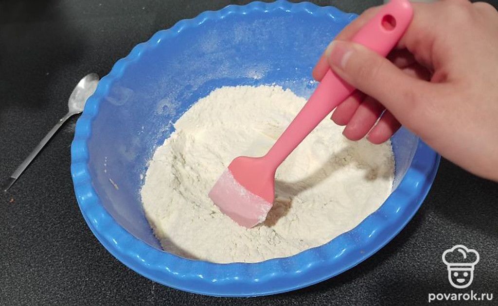 Смешайте сухие ингридиенты: муку, соду, соль.