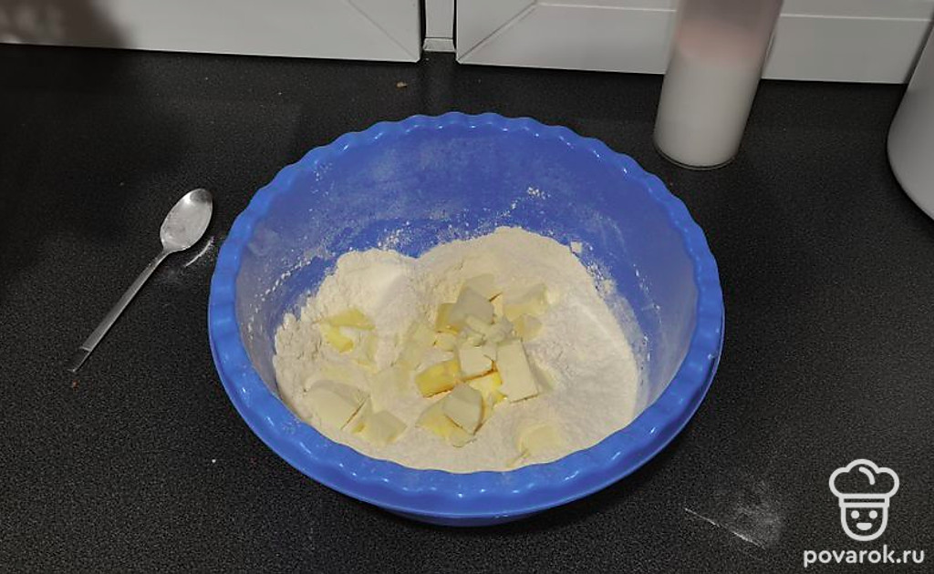 Покрошите масло, смешайте его с мукой.