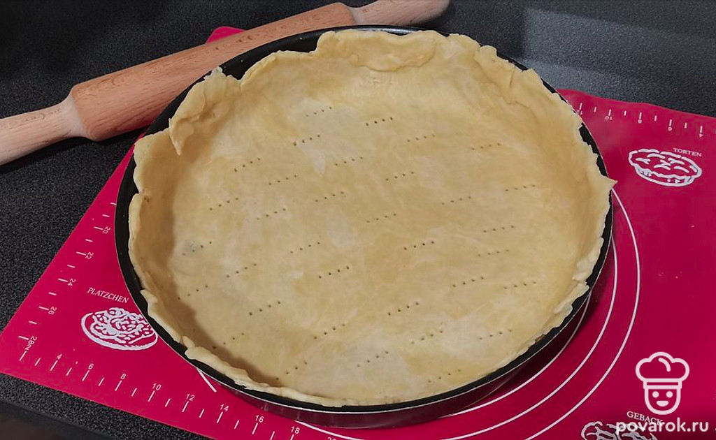 Вилкой проделайте отверстия, чтобы тесто не поднималось.