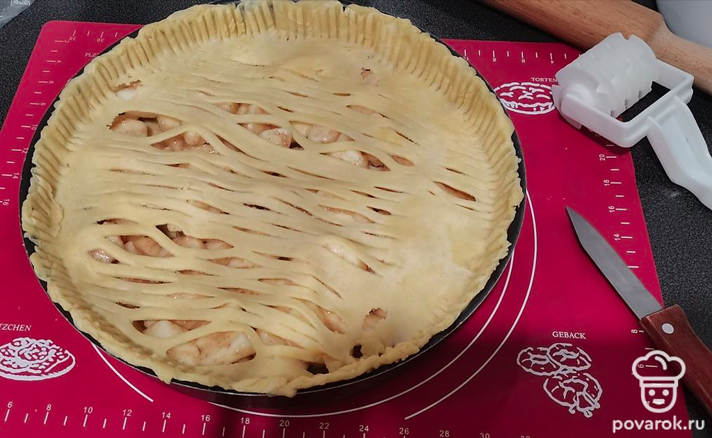 Раскатайте меньший кусочек теста, сделайте в нем отверстия и накройте пирог с начинкой.