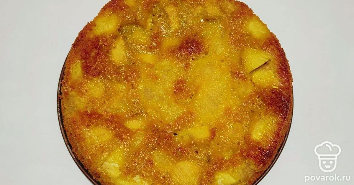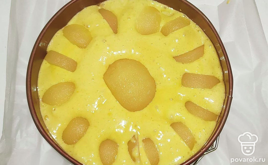 Форму, в которой будете выпекать пирог, застелите пергаментной бумагой, влейте в форму половину приготовленного теста, выложите слой из яблочных долек, затем выложите оставшееся тесто и измельченные груши. Собранный пирог отправьте в духовой шкаф, разогретый до 180 °С, выпекаться в течение 30-40 минут до образования румяной корочки.