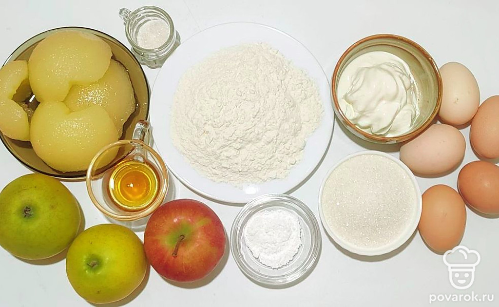 Для приготовления теста в глубокой миске соедините куриные яйца и сахар, добавьте к ингредиентам соль и взбейте массу миксером до пышности. Добавьте к яично-сахарной смеси сметану, раннее просеянную муку и разрыхлитель и вымешивайте тесто деревянной лопаткой, добавив к нему ванилин. Яблоки и груши нарежьте тонкими дольками и приступайте к собиранию пирога.