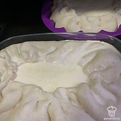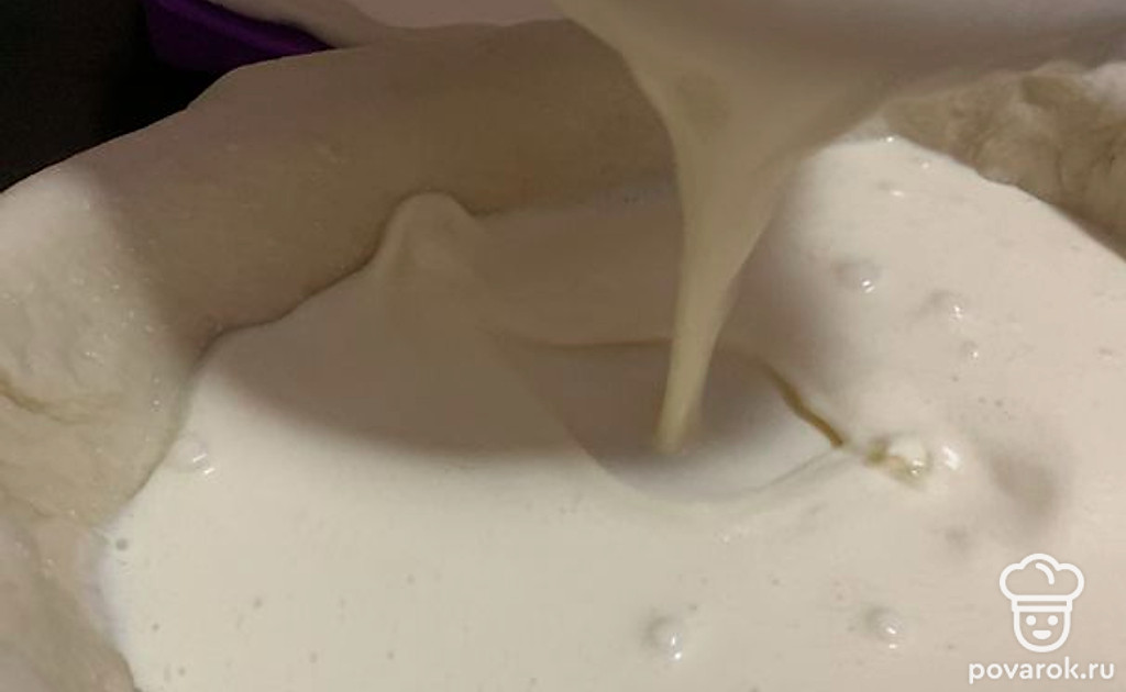 Далее выложить тесто в форму с бортиками и вылить туда сметанную основу.