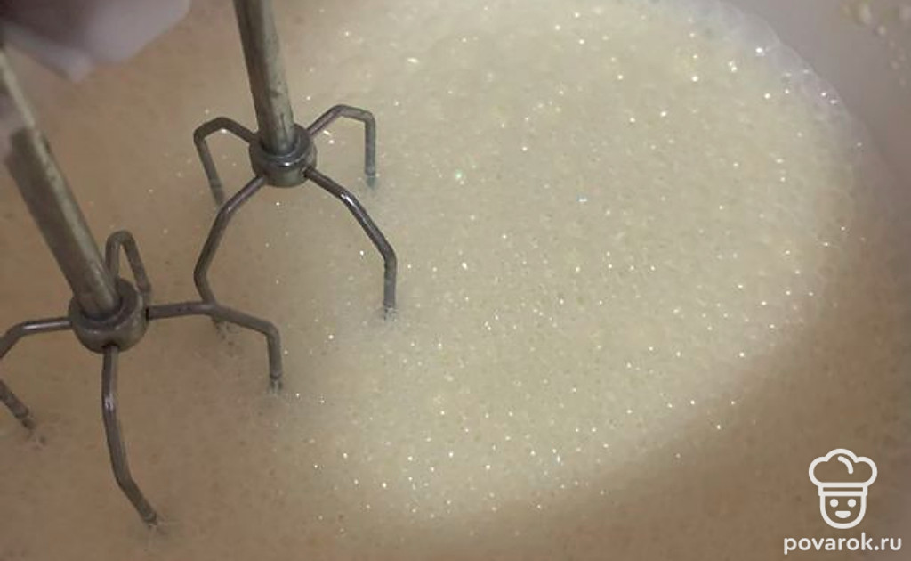 Сделаем начинку: смешать и взбить миксером сметану, 6 яиц и сахар.