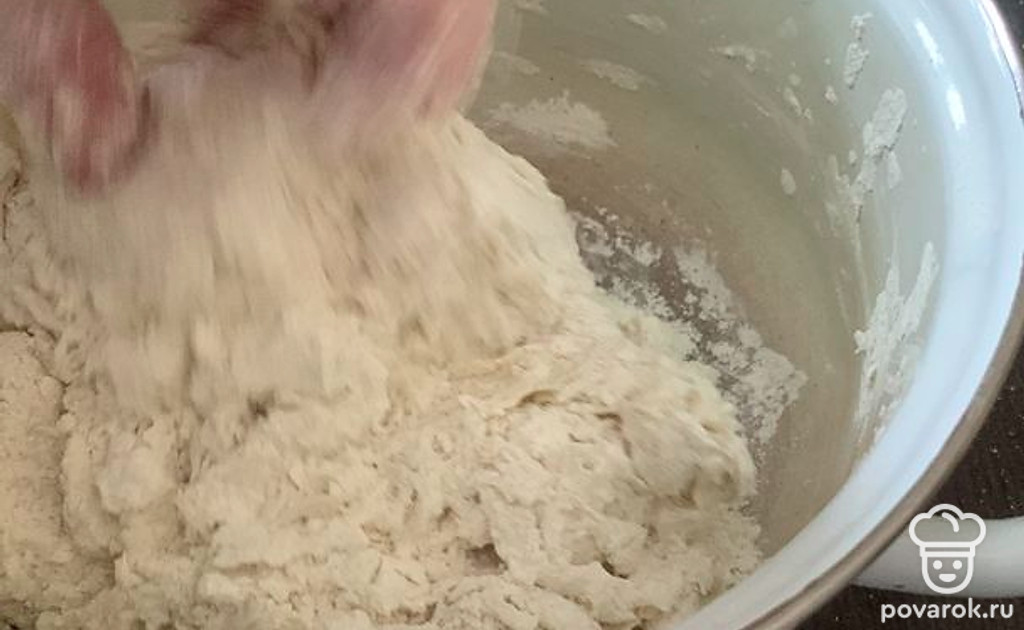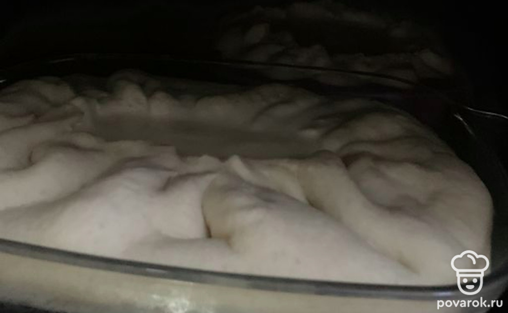 Замесить тесто и оставить на 30 минут в тёплом месте.