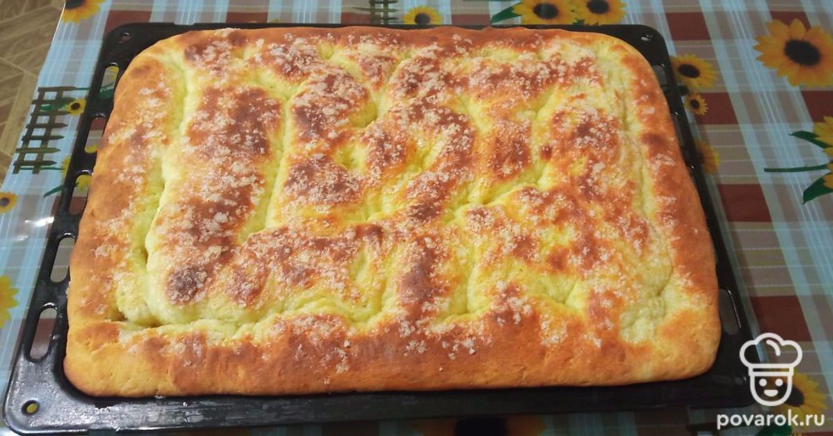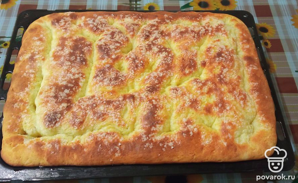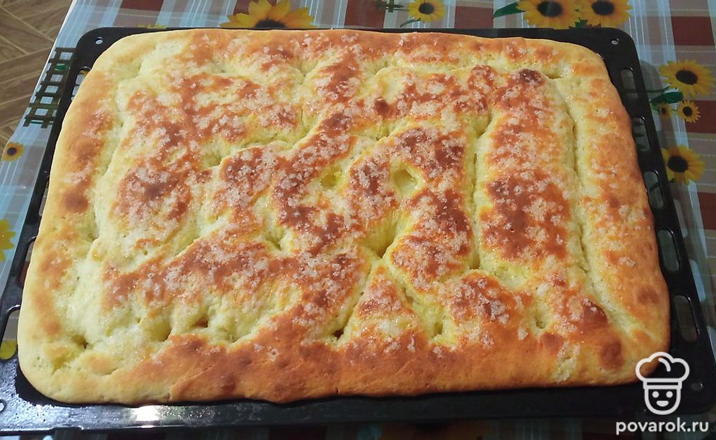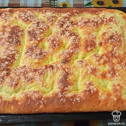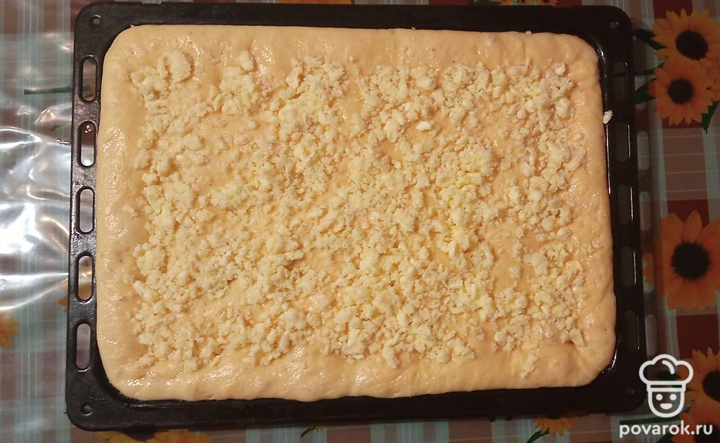 Наше тесто поднялось. Сделайте в нем углубления по всему пирогу и посыпьте крошкой.