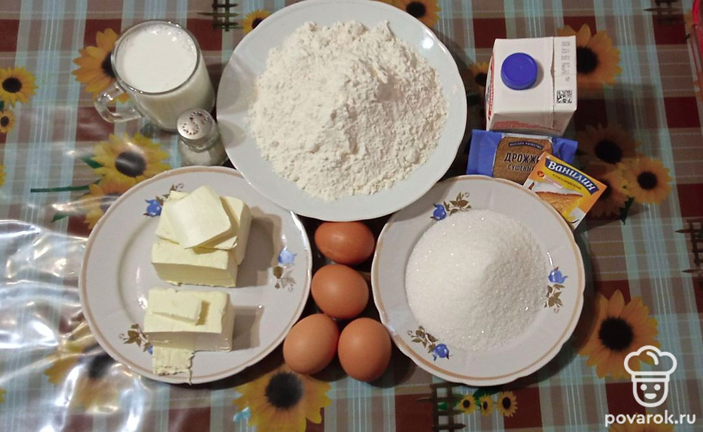 В теплом молоке разведите 250 граммов сахара и дрожжи, оставьте подходить. Разотрите сливочное масло (предварительно немного подтаявшее) с 10 граммами ванильного сахара, яйцами, солью и 150 граммами сахара. Активные дрожжи смешайте с яично-масляной смесью и введите муку. Тесто получается густое и липкое.