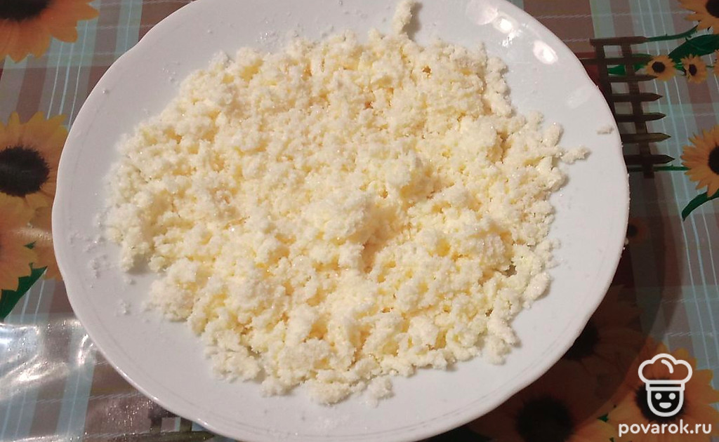 Холодное сливочное масло (100 граммов) перетрите с сахаром (200 граммов) и ванильным сахаром (10 граммов) при помощи вилки. Отправьте крошку в холодильник.