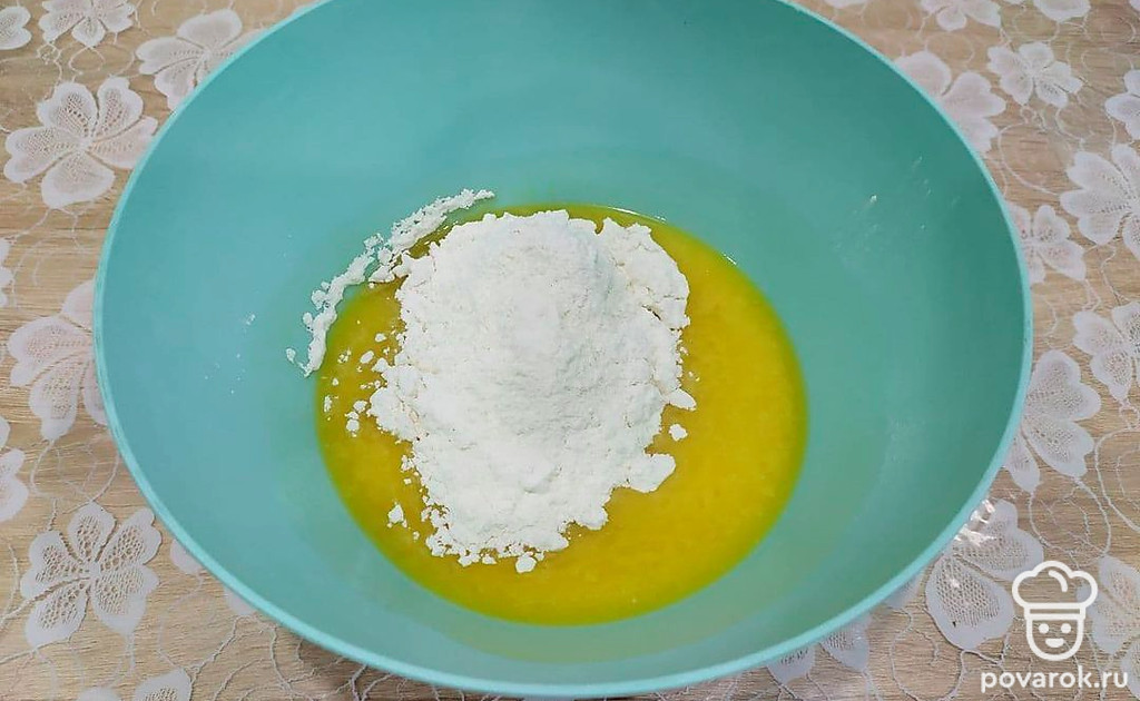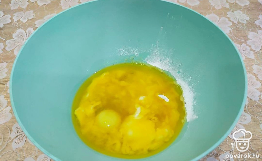 В чашу выложить растопленное сливочное масло (или маргарин), добавить яйцо, соль, сахарную пудру (или сахар) и перемешать.