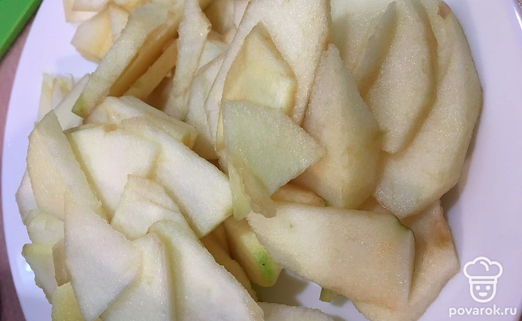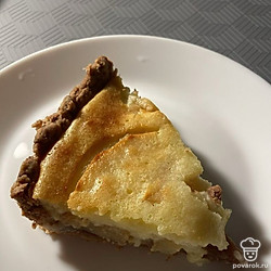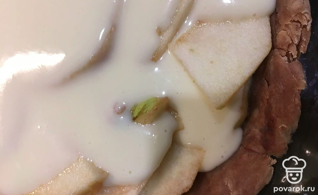 Распределить по форме тесто, сверху выложить яблоки и затем залить начинкой.