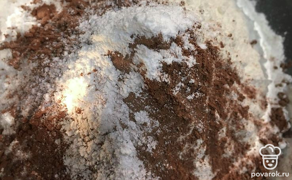 Соединить сухие ингредиенты для теста: мука 200г, разрыхлитель 1 ч.л., какао 1 ст.л. Перемешать.