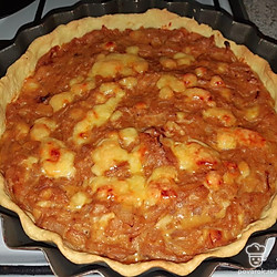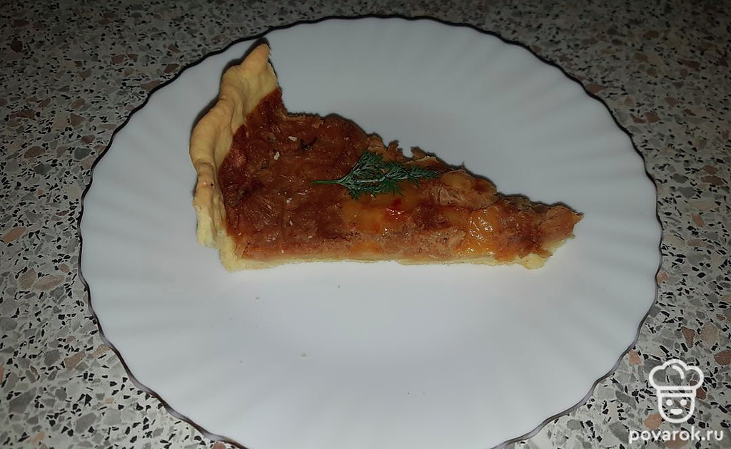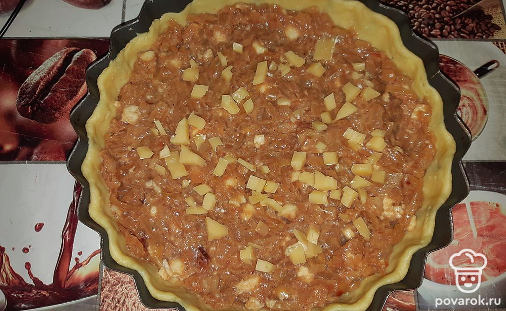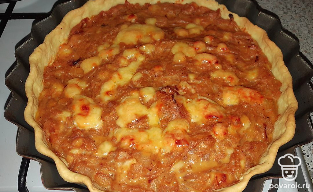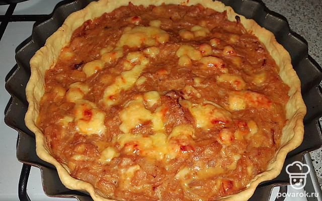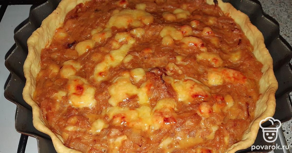 Раскатать тесто и уложить в форму, сверху выложить луковую начинку. Выпекать 30 минут при 170 градусах.