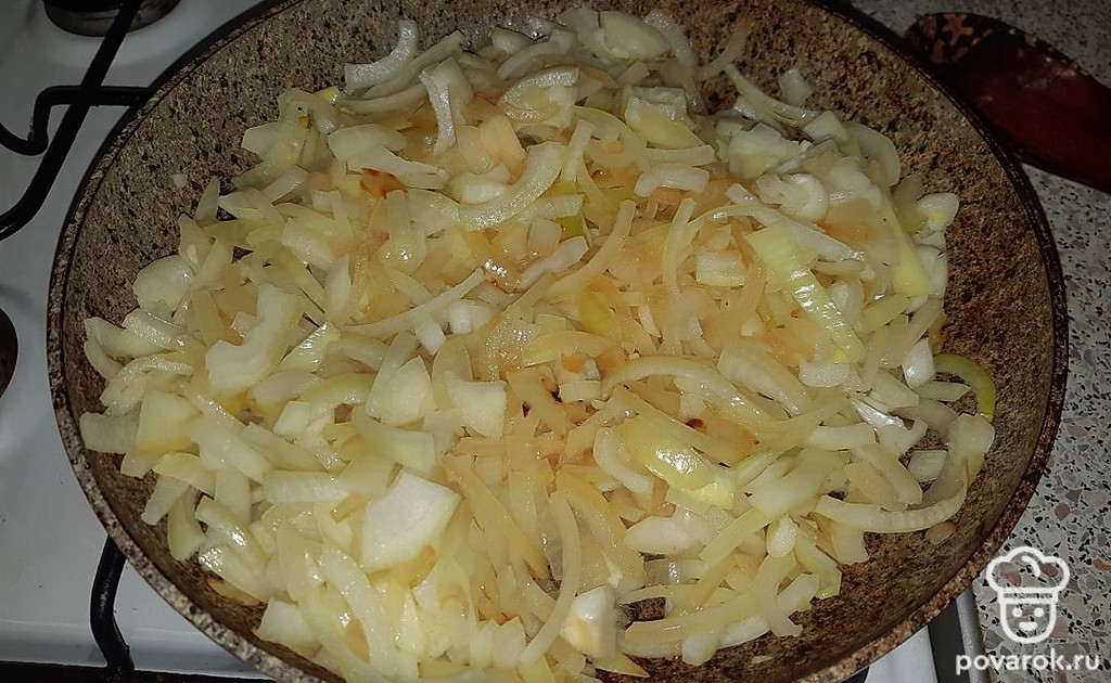 Очистить лук, разрезать на 4 части и нашинковать соломкой. На растительном масле обжарить лук до золотистого цвета, посолить. Добавить молоко и протушить лук.