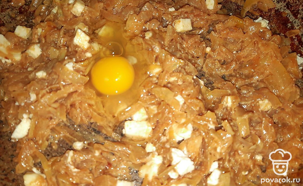 В остывший лук вмешать яйцо и нарезанный мелкими кубиками сыр.