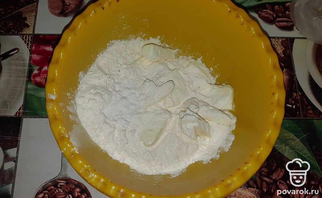 Для теста перетереть холодное масло с мукой, солью. Влить в массу холодную воду и вымешать до гладкой и упругой массы. Оставить отдохнуть в холодильнике на 30 минут.