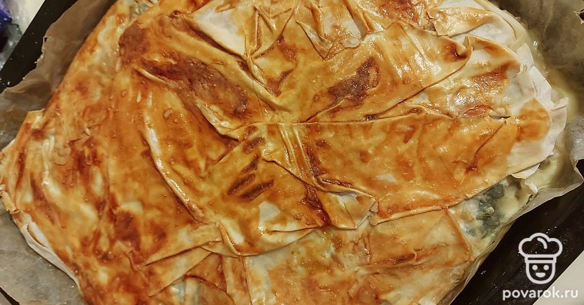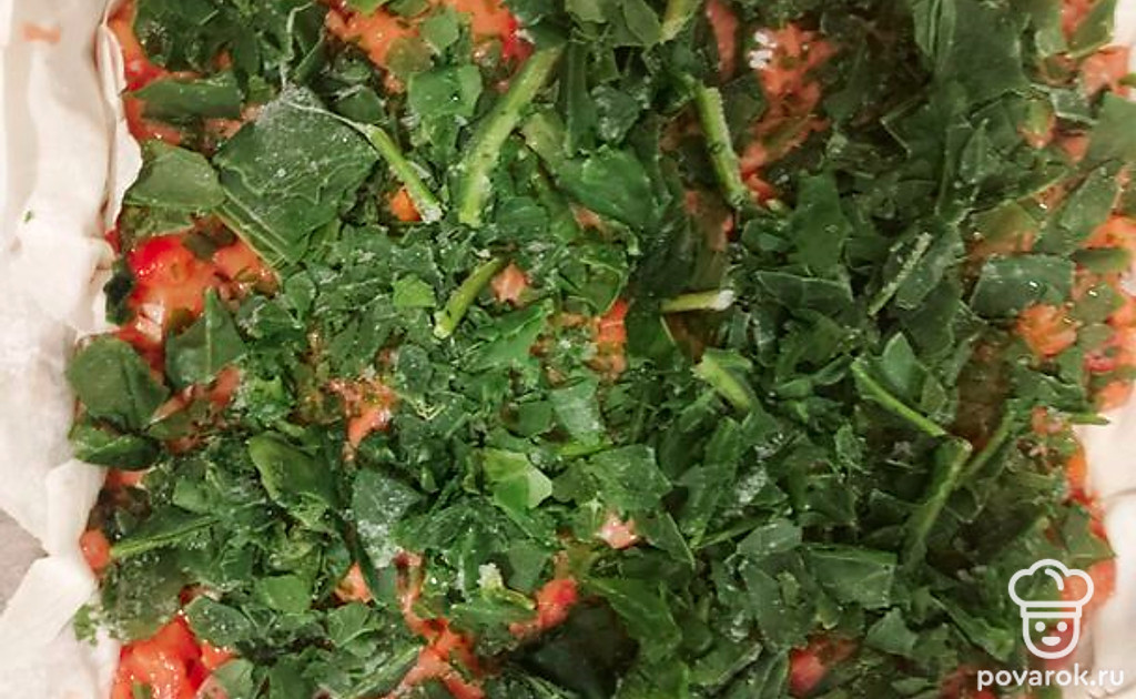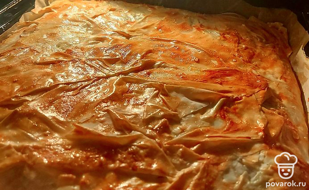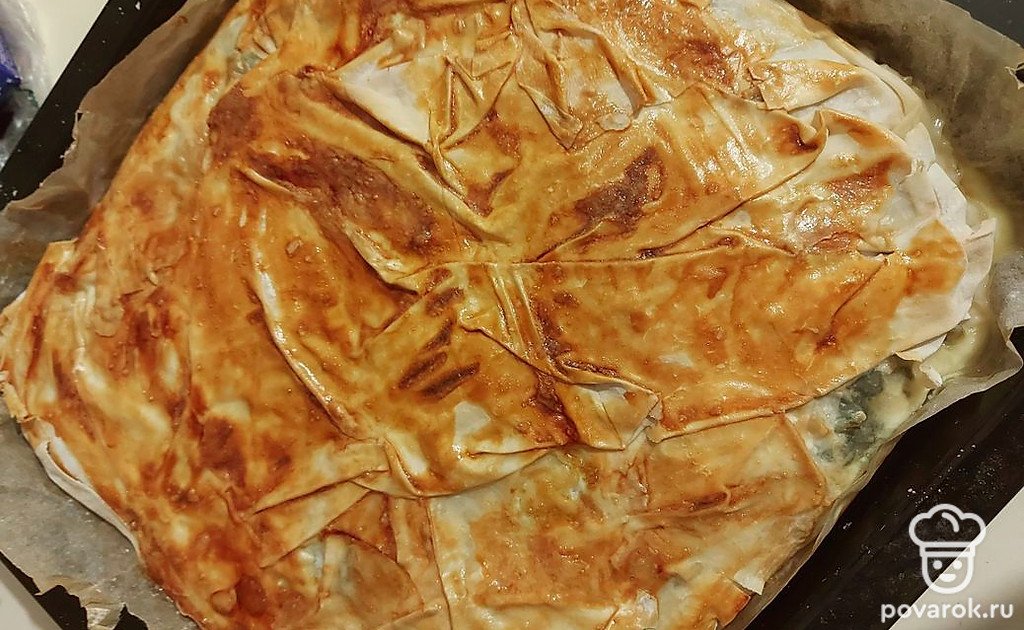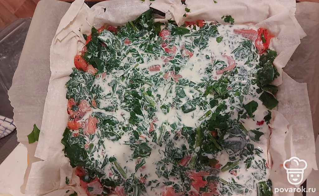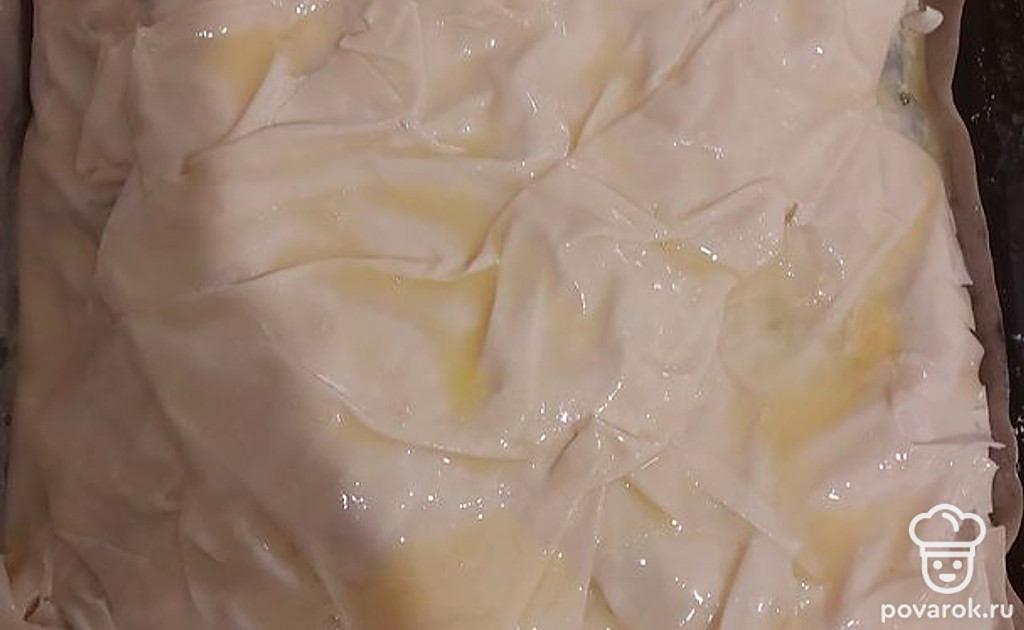 Красиво разложить оставшиеся 7-10 листов теста, чтоб закрыть начинку, смазать яйцом.
