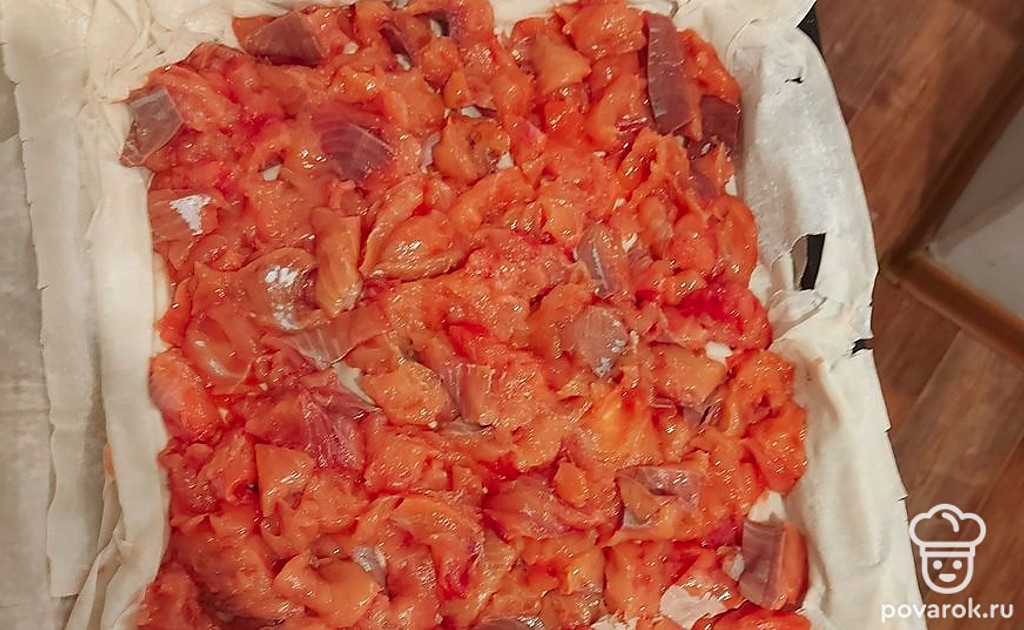 Противень застелить бумагой для выпечки. Разложить 8 листов теста. Выложить нарезанное филе рыбы.