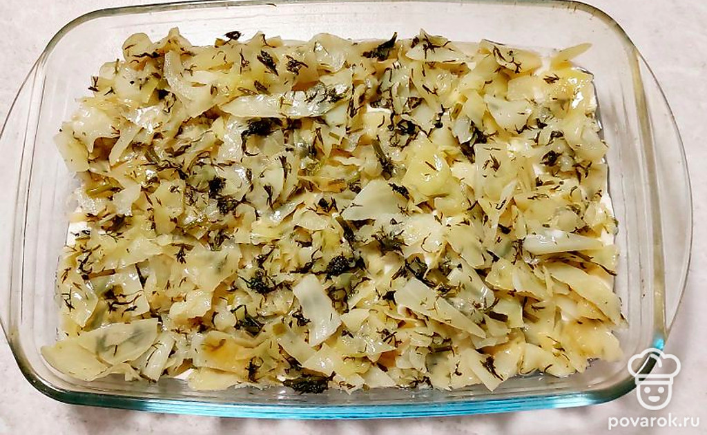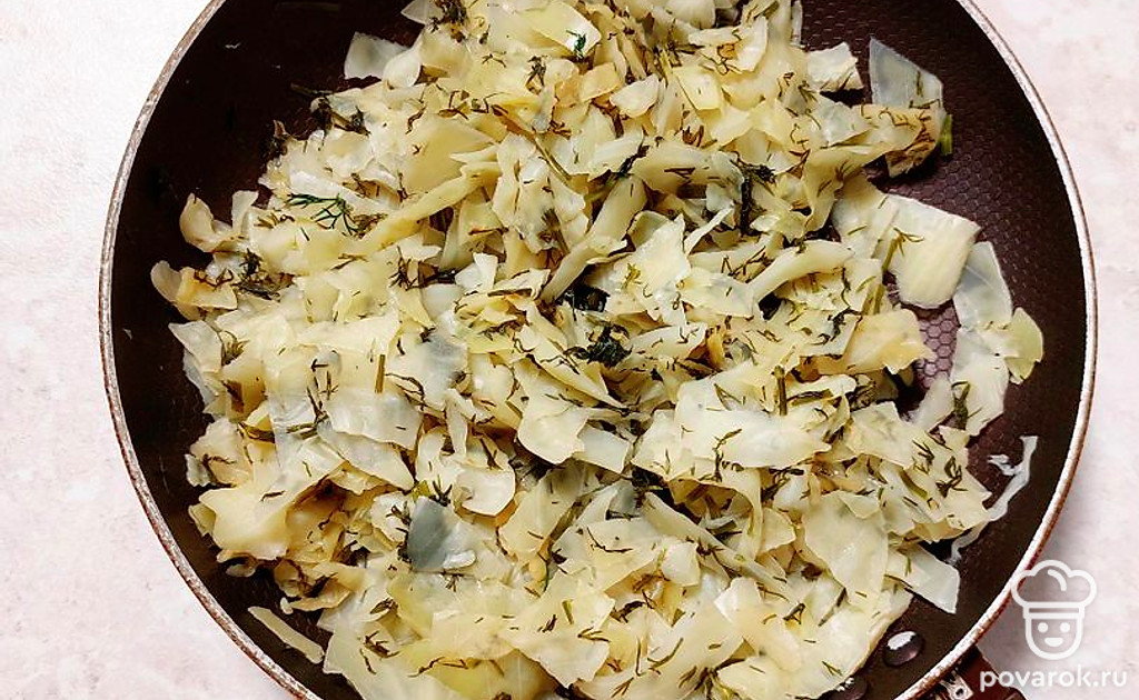 Для начинки капусту порубим и обжарим на сковороде 15-20 минут, чтобы не пригорела в начале, можно подлить немного воды. В конце добавим соль и укроп. Оставим остужаться.