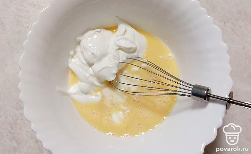 Для теста взобьем венчиком или вилкой яйца и сметану. Добавим муку, соль и хорошо перемешаем.