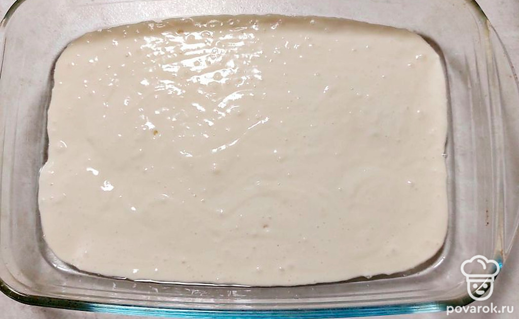 Форму для запекания смажем растительным маслом. Выложим половину теста на дно.