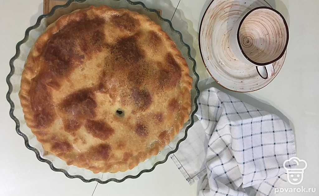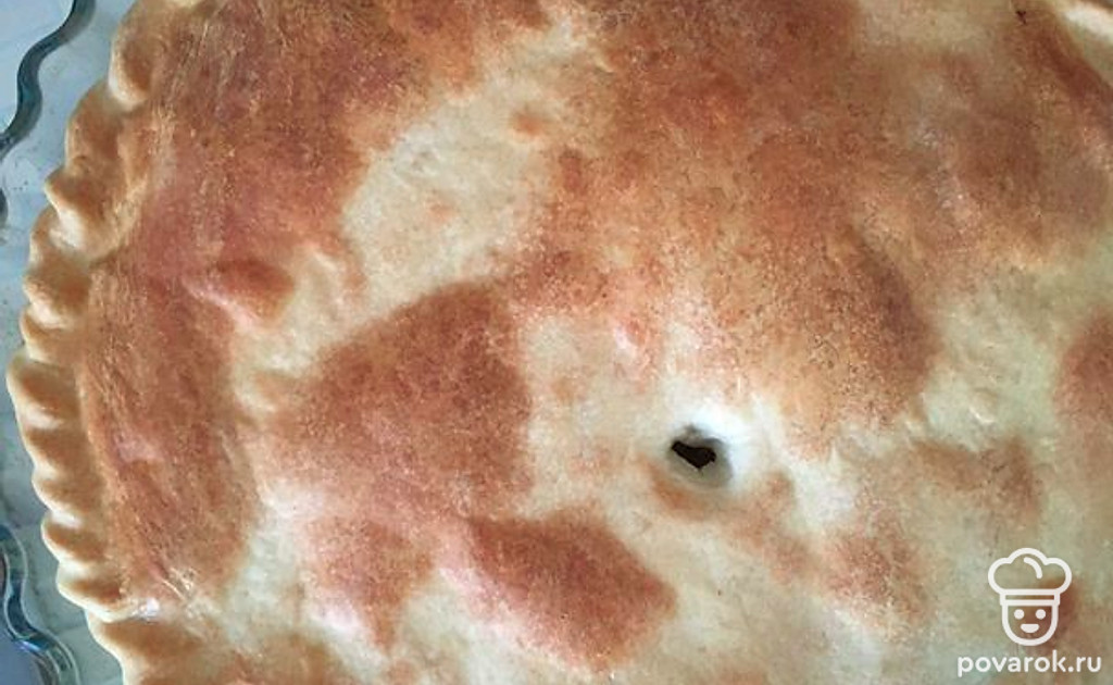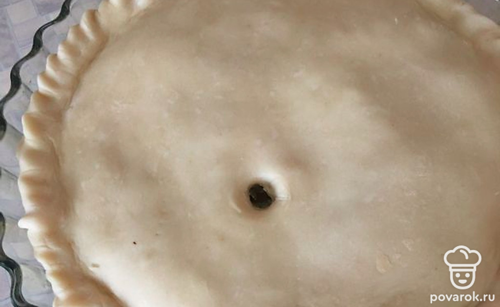 Накройте второй частью теста, защипните края пирога и сделайте небольшое отверстие сверху. Сверху пирог смажьте молоком.