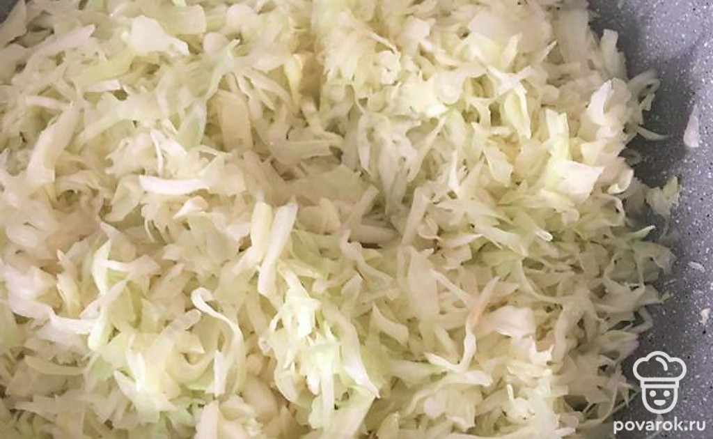 Для начинки нарежьте лук полукольцами, нашинкуйте капусту, разомните, подсолите и недолго тушите на медленном огне, только до мягкости.