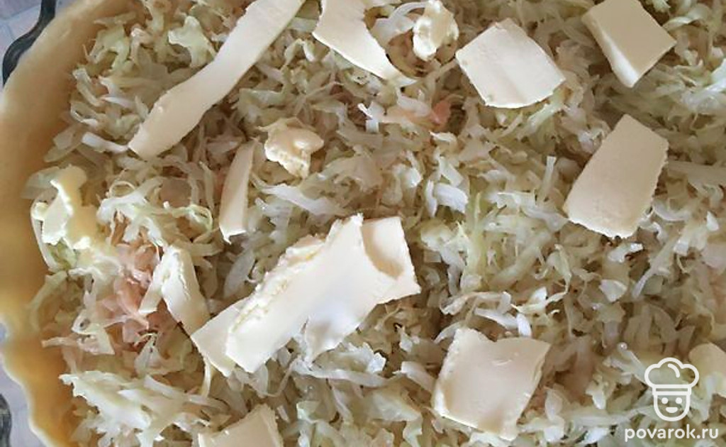 Тесто разделите на 2 части. Раскатайте первую часть теста как толстый блинчик диаметром чуть больше формы. Выложите начинку, сверху на начинку можно положить кусочки сливочного масла.