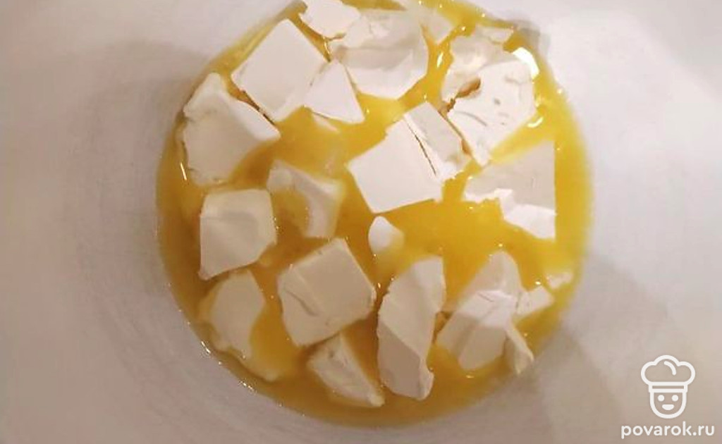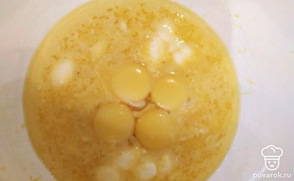 Масло растопите на медленном огне. Снимите с огня. Добавьте сахар, соль и цедру. Хорошо перемешайте миксером.