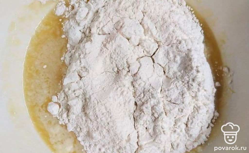 В масляную смесь постепенно введите муку, смешанную с разрыхлителем. Затем в тесто добавьте взбитые белки и аккуратно перемешайте лопаточкой.