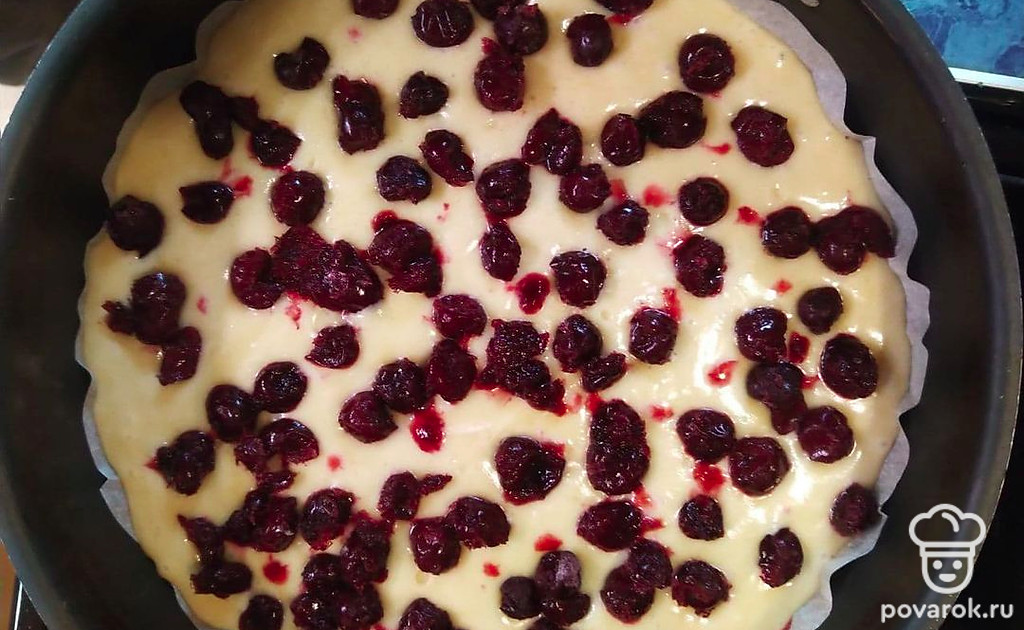 Выложите в форму, застеленную пергаментом. Сверху положите слой вишни.