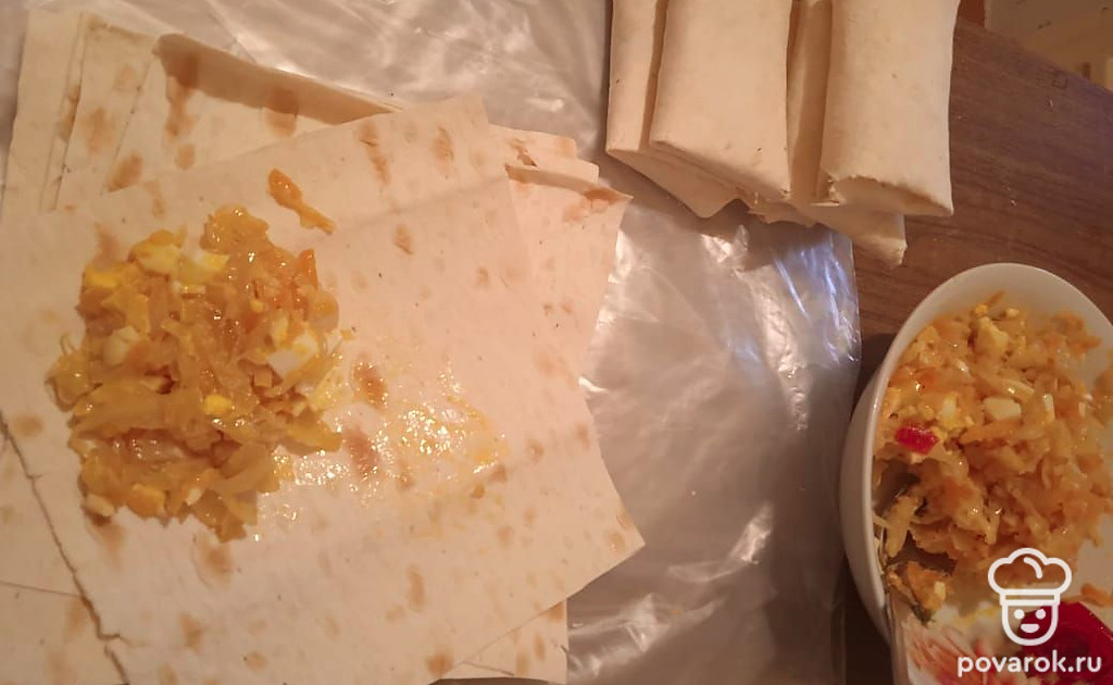 Лаваш разрежьте на квадраты (у меня получилось 12 шт), смажьте сметаной (так лаваш будет гибким). Выложите начинку и сверните конвертом.