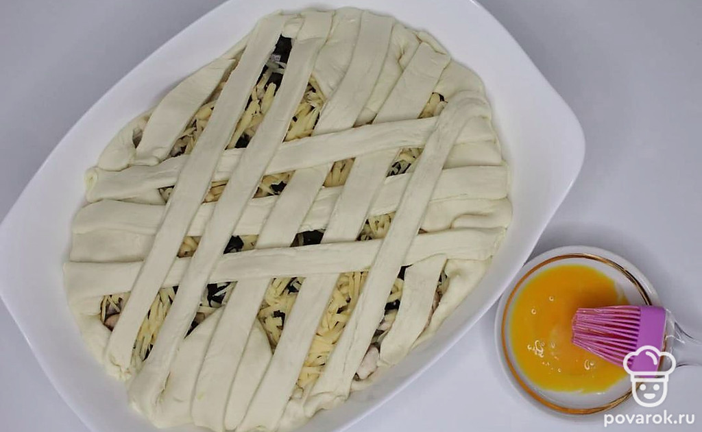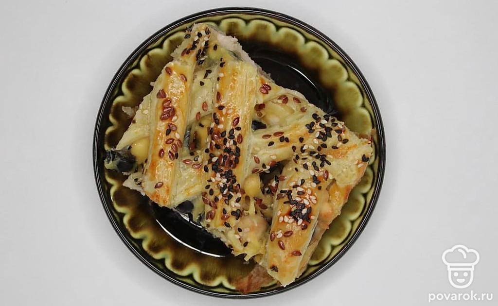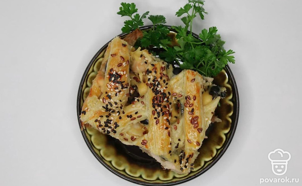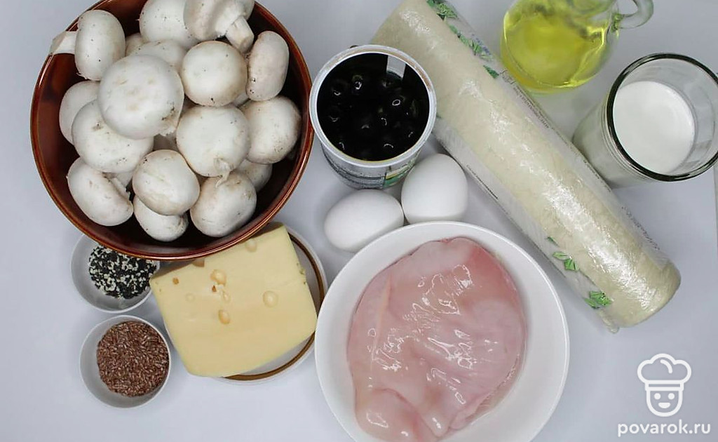 Слово «пирог» произошло от слова «пир». Использование разнообразных начинок в сочетании с различными способами формирования дает большое многообразие выпеченных изделий. Закрытый куриный пирог с шампиньонами, сыром и маслинами можно сделать маленький или большой, круглый или квадратный. Его поверхность можно оформить различными элементами из теста: решеткой, цветами, листочками, веточками и т. д. Он может быт повседневным и праздничным.