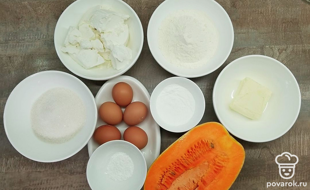 Тыкву промойте, разрежьте на куски. Отмерьте все продукты, просейте муку и смешайте ее с разрыхлителем. Размягчите сливочное масло в микроволновке. Разогрейте духовку до 180 ºC и приготовьте миксер, разъемную форму диаметром 24-26 см, а также лист пергамента.