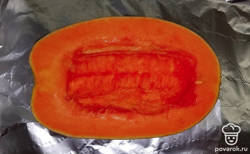 Заверните кусок тыквы в фольгу, уложите на противень и запекайте в духовке 1 час. Пока запекается тыква, приготовьте песочное тесто – смешайте размягченное сливочное масло, сахар и 1 яйцо до однородной массы, высыпьте муку с разрыхлителем и замесите тесто прямо в миске.