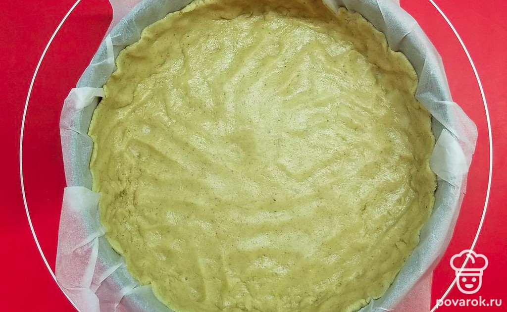 Выложите получившееся тесто на лист пергамента и расплющите руками в круг диаметром на пару сантиметров больше чем диаметр формы. Положите лист с тестом в форму, и поставьте форму в холодильник.