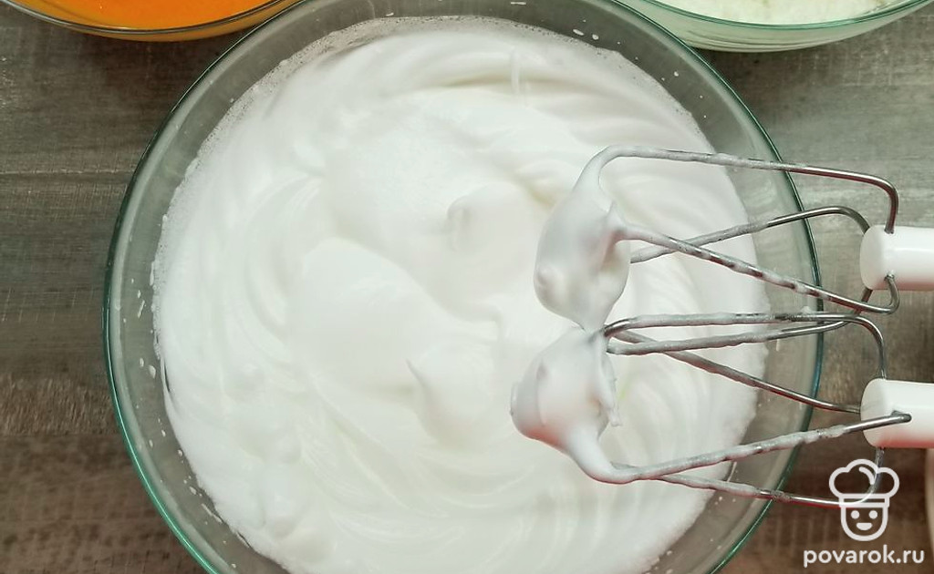 Взбейте миксером на высоких оборотах белки до плотной устойчивой пены. Половину взбитых белков добавьте в миску с тыквенной начинкой, а половину – в миску с начинкой из рикотты. Аккуратно перемешайте ложкой, чтобы пена не опала и начинки остались при выпечке воздушными.