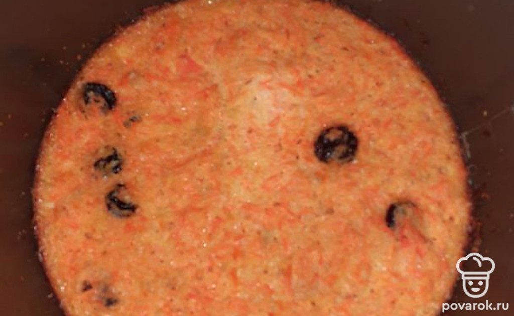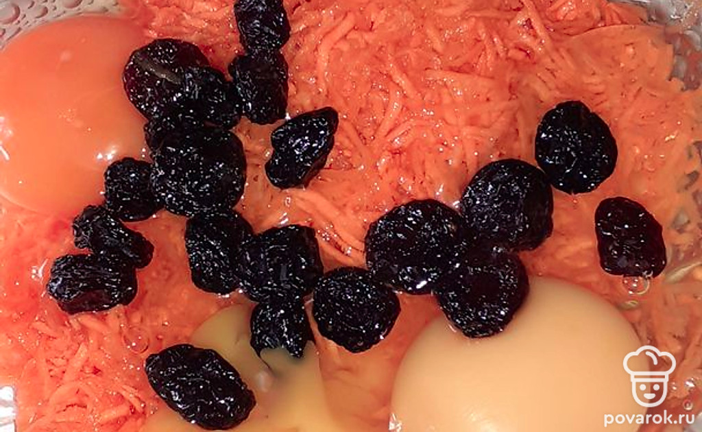 К моркови добавьте 3 яйца, горсть изюма, сахар и овсяную муку. Все перемешайте.
