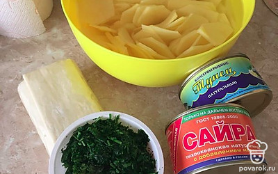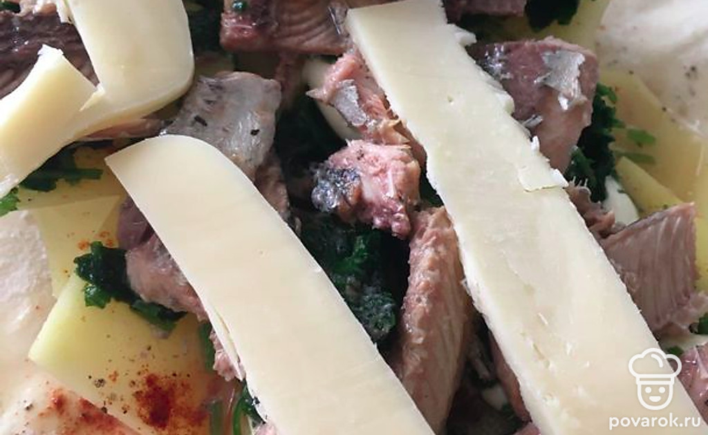 Приступайте к сбору пирога. Слегка раскатайте тесто. По середине выложите в 2-3 ряда картофель. Посолите и поперчите по вкусу. Далее выложите рыбу. Добавьте немного майонеза. Посыпьте зеленью и выложите сыр.Далее по периметру теста сделайте надрезы с отступом по 1-2 см, поперек и вдоль. Сверните их друг на дружку, чтобы завернуть пирог.