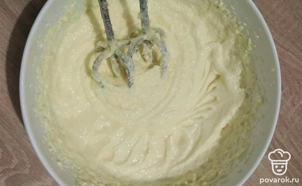 Мягкое сливочное масло взбейте с сахаром, яйца взболтать вилкой и тонкой струйкой в яичную смесь постоянно взбивая миксером. Добавьте ванильный сахар, муку, разрыхлитель, хорошо перемешайте миксером на маленьких оборотах.