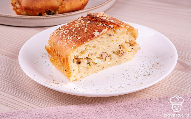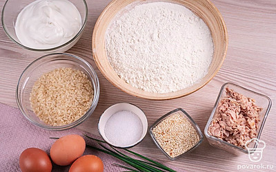 Для рыбного пирога подойдет любая консервированная рыба. Заранее отварите рис и яйца и остудите их, подготовьте сухие ингредиенты и сметану.
