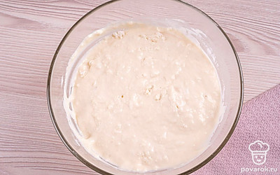 Смешайте в глубокой миске муку, сметану, соль и сахар. Должно получиться не очень густое, тягучее тесто.