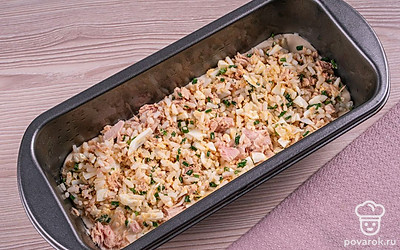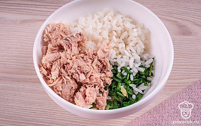В миске смешайте консервированную рыбу, рис, порубленные яйца и зеленый лук