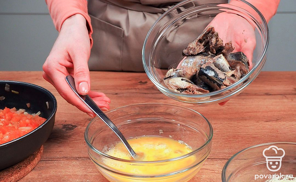 Приготовьте начинку. Обжарьте помидоры, лук и чеснок на растительном масле 5-7 минут до золотистого цвета и снимите с плиты. В отдельной емкости взбейте яйца, добавьте сардины и разомните рыбу на небольшие кусочки, посолите и поперчите. Добавьте овощную обжарку и тщательно перемешайте.