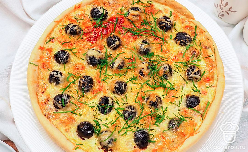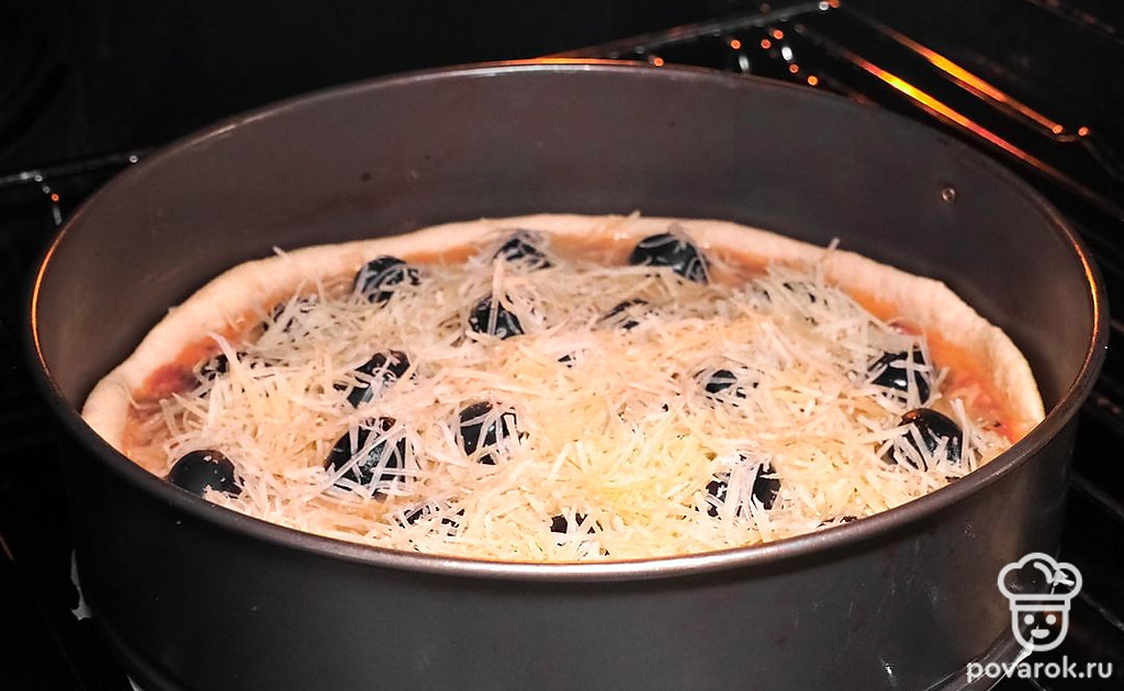 Испеките пирог. Включите духовку на 180 градусов. Переложите начинку в тесто, добавьте маслины, тертый сыр и равномерно распределите его по поверхности. Выпекайте киш в течение 30-40 минут.