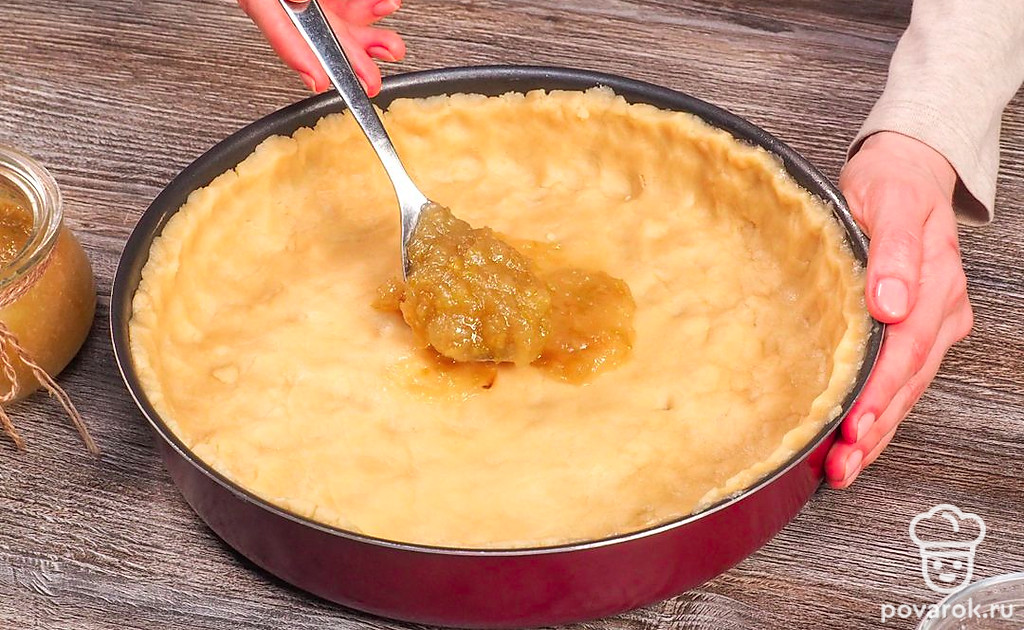 Подготовьте тесто и форму для выпечки. Форму для выпечки слегка смажьте маслом, большую часть теста равномерно распределите по форме, формируя бортики. Пока тесто в морозилке подмерзает, форму с тестом поставьте в холодильник. Выложите слой джема в форму и равномерно распределите ложкой по всей поверхности.