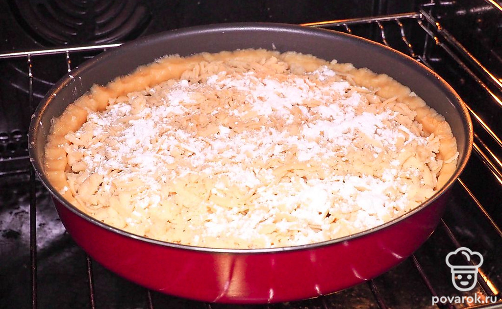 Поставьте пирог запекаться в духовку. Достаньте замороженную часть теста и натрите на крупной терке, заполняя всю поверхность джема. Сверху присыпьте 1 ч.л. сахарного песка для получения более аппетитной и румяной карамельной корочки. Поставьте форму в предварительно разогретую до 180 градусов духовку на 35-40 минут.